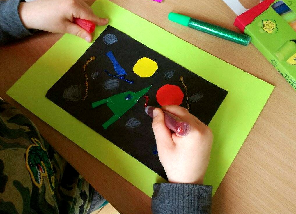 Kolejnym krokiem było już poruszenie fantazaji dzieci i stworzenie kosmicznego obrazka za pomocą przygotowanych materiałów. Dzieci wycinały rakiety, planety, gwiazdy, księżyce i ozdabiały całość klejem brokatowym.